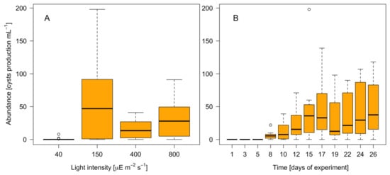 Resting cyst formation in the Cross-P culture according to the tested light intensities (A) and experimental time (B).