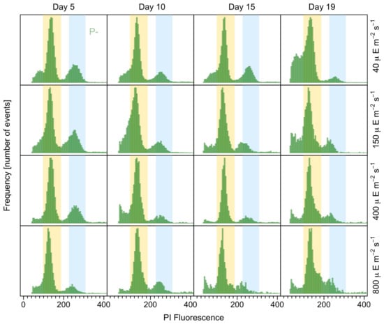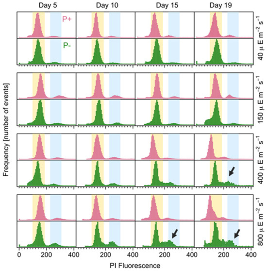 The effects of the different treatments on the cell cycle were explored via cytometry. The percentages of 2C and 4C cells were sensitive to the irradiance level, not to the culture medium. For the Clonal and Clonal-P cultures, the highest percentage of 2C cells occurred at 150 µE m−2 s−1 and the lowest percentage occurred at 40 µE m−2 s−1 (Table 4). For the Clonal cultures, the highest percentage of 4C cells occurred at 800 µE m−2 s−1 and the lowest percentage occurred at 40 and 150 µE m−2 s−1. For the Clonal-P cultures, the highest percentage of 4C cells was detected at 400 µE m−2 s−1 and the lowest percentage was detected at 150 µE m−2 s−1 (Table 4).