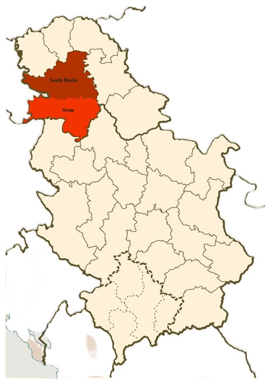 The map of the examined epizootiological areas (South Backa and Srem districts).