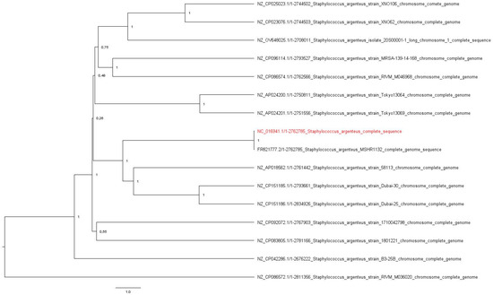 Also, to better understand the isolate’s resistance and invasiveness capability, the following plasmids were investigated: the pSAS plasmid (reference sequence BX571858; 20,652 base pairs, bp) with the rep16 gene and belonging to the family of Inc18 was found, with an identity and length match of 100% for Coding Sequence 8. In addition, the plasmid pN315 (reference sequence AP003139; 24,653 bp) with the rep5a gene and belonging to the plasmid family Rep3 was detected, with a length match of 100% and an identity percentage of 99.88% (one single-nucleotide polymorphism) in the Coding Sequence of SAP001. Regarding the virulence genes, a perfect match in length and sequence was declared with the scn gene, a staphylococcal complement inhibitor, and a 99.6% identity match was found with the sak gene encoding staphylokinase. Just one MGE was found: ISSau5 (NC_002952.2), belonging to the IS30 family, an insertion sequence of 1136 nucleotides. The evolutionary relation of the 16 genomes was calculated and the original tree, with a total of 2,834,926 positions, was analyzed. The isolate’s genome is most likely related to the S. argenteus MSHR1132 strain (Figure 1).