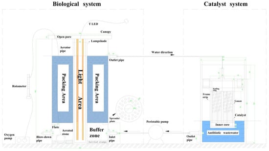 In this device, the influent buffer zone mitigated the adverse effects of wastewater on the biological system. The buffer zone comprised a spherical aeration stone, with a diameter of 4 cm, and a water cloth plate, with fine holes set 6 cm high. These components facilitated the water flow and aeration dispersion, ensuring an optimal distribution throughout the buffer zone. The light source comprised 3 cm external lampshades and two internal 6 W LED plant growth lamps, emitting light at approximately 460 nm. The light intensity could be adjusted. The biofilm reactor was designed with an upward flow, a downward inlet, and an upward outlet. Once the overflow port became full, water was automatically directed into the inner core, loaded with catalysts. The right side of the device accumulated water, and a peristaltic pump pumped the water at a uniform rate into the biofilm reactor through a controlled flow rate. This process was designed to circulate water, continuously degrade pollutants, and realize the dynamic coupling of the Bio-Fenton process.