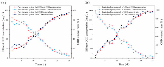 Changes in effluent COD concentration and removal rate of (a) bacterial system and (b) bacteria–algae system during membrane hanging.