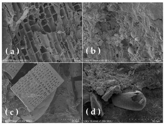 Figure 4 demonstrates the microbial adhesion to the surface of the bamboo charcoal before and after filming. Figure 4a,b clearly show that the internal pores of the clean bamboo charcoal without filming were in the shape of hollow bamboo joints, with no signs of microbial adhesion around them. In the middle and late stages, bamboo charcoal pores were gradually filled with mainly filamentous microorganisms, and the interpore spaces were covered with an adhered biofilm. Figure 4c,d show roller-shaped and oval-shaped objects with mottled patterns, which we suspected were microorganisms. Comparing the film-carrying condition of the bamboo charcoal pores before and after coating, along with the yellowish-brown film visible on the surface of bamboo charcoal and the slippery feel, it was concluded that the biofilm on the filler of system was mature, and the coating of the bamboo charcoal was successful.