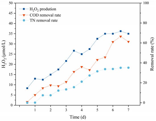 The H2O2 generation, COD removal, and TN removal in the pure algae system were measured over 7 days, and the data are shown in Figure 5. H2O2 production showed an increasing trend as incubation progressed with algae, which gradually rose from 5 μmol/L to 35 μmol/L. Indeed, under photosynthetic conditions, algal cells proliferated in the logarithmic phase and constantly produced ROS molecules such as ·O2− and H2O2. Then, the concentration of hydrogen peroxide in the system stabilized, which may have been related to the algae’s antioxidant protection mechanism. When algae’s ability to generate reactive oxygen molecules is inhibited, metabolic disorders or cellular deformation occur in the algal cells. However, an excess of strong extracellular oxidative substances further inhibits cellular activity. At this time, the algae initiate a free radical scavenging mechanism to reduce oxidative stress through the decomposition of excess H2O2 [36,37]. In general, the rate of H2O2 production in the pure algae system first increased and subsequently decreased throughout the incubation period. COD removal was as high as 66.48%, whereas TN removal was only as high 35.17%, due to the nitrogen limitation that is induced when the N/P ratio is less than 5:1 [38]. By the fifth day, the rate of H2O2 production in the system and the removal efficiency of TN and COD by the algae reached a plateau, indicating a stagnant or even declining trend. This was attributed to the fact that some algal cells had begun to enter the decline phase from the stable phase. Additionally, the single algal system lacked continuous access to CO2, so they could not degrade most pollutants cyclically.