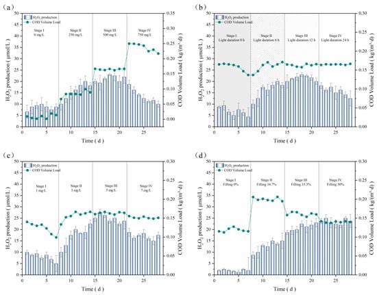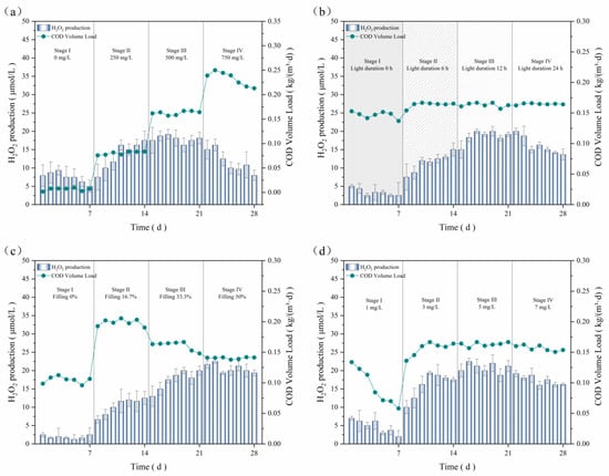 The effects of the light duration and bamboo charcoal filling rate on the bacteria–algae system were the same as those in the pure bacterial system. As shown in Figure 7b, it can be seen that the average H2O2 production increased gradually when the light duration was increased from 0 h to 12 h, beyond which it decreased. The average H2O2 production and COD volumetric loading of the system were optimal when the light duration was 12 h (stage III), which stabilized at 21.49 μmol/L and 0.163 kg/(m3·d), respectively. At stage IV, the average H2O2 production gradually reduced to 15.68 μmol/L, which decreased at a faster rate than that in the pure bacterial system, since the continuous light disrupted the alternating cycle of photosynthesis and respiration, which mainly affected the physiological cycle of the algal cells in the bacteria–algae system [39]. Consequently, in the subsequent experiments, we used an optimal light duration of 12 h. The effect of the bamboo charcoal filling rate on the H2O2 production and COD volumetric loading of the bacterial-algae system is presented in Figure 7c, and 33.33% was selected as the optimal rate. Under this condition, the average H2O2 production was 21.02 μmol/L in this system, which was 3 μmol/L higher than that in the pure bacterial system.