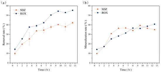 (a) Removal rate and (b) mineralization rate of SDZ and ROX: the influent ROX and SDZ concentrations were 10 mg/L, glucose addition was 0.5 g/L, HRT was 4.5 h, water temperature was 20 ± 2 °C, pH = 7.5, DO was 5 mg/L, light intensity was 1000 Lux, and 50 g of iron-carrying catalyst was used.