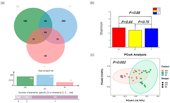 Alpha diversity and beta diversity of the tepals of L. delavayi. (a) Endophytic fungi Venn diagrams of W, CX, and CY. (b) Shannon indices of tepal fungal communities in W, CX, and CY. (c) PCoA analysis of endophytic fungal communities in W, CX, and CY. The Bray–Curtis distance matrix was used, where the horizontal and vertical percentiles represent the degree of interpretation of the samples on the first and second principal axes, respectively.