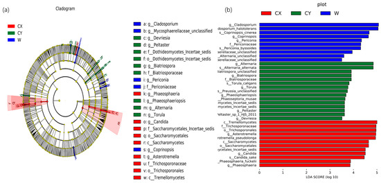 Biomarkers of endophytic fungi in the tepals of W, CX, and CY. (a) The LEfSe clade diagram shows the differences between W, CX, and CY at the boundary, phylum, class, order, family, genus, and species levels. Each continuous circle represents a phylogenetic level, the size of the circle represents the abundance, the different colors represent the taxa enriched by endophytic fungi in the tepals of L. delavayi in different cultivated and domesticated states, and the different taxa are listed on the right side of the branch diagram. (b) LDA bar chart showing fungal taxa, showing only taxa with LDA > 3.5.