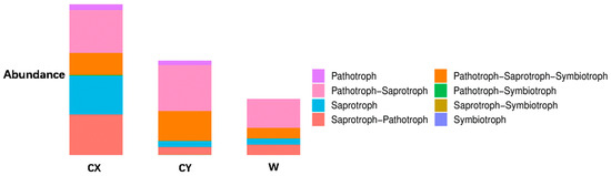 When annotating the functional profiles of endophytic fungi in the tepals of L. delavayi, these fungi were classified into three categories based on their nutritional modes: pathotrophs, symbiotrophs, and saprotrophs. After annotating endophytic fungi in the tepals of wild and cultivated specimens from two different regions, it was found that the main nutritional types were the pathotrophic–saprotrophic mixed type, pathotrophic–saprotrophic–symbiotic mixed type, saprotrophic nutritional type, and saprotrophic–pathotrophic mixed type. Among the cultivated specimens, in addition to the pathotrophic nutritional type showing a significant growth trend, the pathotrophic–saprotrophic mixed type, pathotrophic–saprotrophic–symbiotic mixed type, symbiotic nutritional type, and pathotrophic-symbiotic mixed type all showed growth trends. Compared with those in W, the abundance of the saprotrophic nutrient type in CX significantly increased, while that in CY did not increase (Figure 4).
