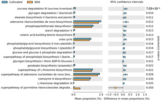 STAMP differential analysis of the prediction of the endophytic function of wild and cultivated L. delavayi tepals on the basis of the KEGG database (level 3). The results of the STAMP analysis in the figure are available only for the first 30 functions with p < 0.05 in the results of the t test for the difference in the two comparisons, and the results show statistically significant functions (95% confidence intervals).