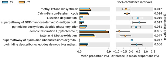 In the comparison between CX and CY, a total of nine metabolic pathways showed statistically significant changes. Aerobic respiration I (cytochrome c), mitochondrial fatty acid beta-oxidation, methyl ketone biosynthesis, and the Calvin cycle were significantly greater in wild-acclimated cultivars than in horticultural cultivars. Conversely, the remaining pathways—L-leucine degradation I, the superpathway of GDP-mannose-derived O-antigen building block biosynthesis, pyrimidine deoxyribonucleoside phosphorylation, de novo biosynthesis of pyrimidine deoxyribonucleoside I, and the superpathway of pyrimidine ribonucleoside degradation—showed the opposite trend (Figure 7).