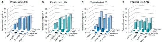 Incidence of solicited local pain in the FV-naïve cohort PD1 (A) and PD2 (B), and in the FV-primed cohort PD1 (C) and PD2 (D). FV: flavivirus, PIZV: purified inactivated Zika virus vaccine, PD: post-dose.