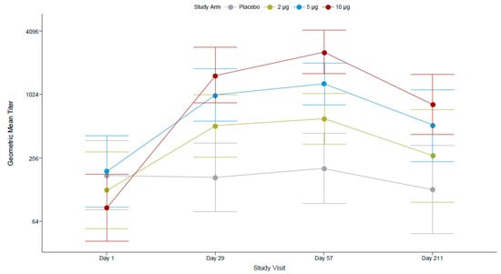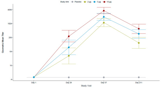 The GMTs overlapped between the 5 µg and 10 µg TAK-426 groups, suggesting they were comparable at either time point up to 6 months PD2 (GMT ratios ≤ 2). The GMT ratios between the 2 µg and 10 µg TAK-426 groups were 3.1 (95% CI: 1.3–7.1; p = 0.01) at 28 days PD1, 3.7 (95% CI: 2.0–6.8; p < 0.0001) at 28 days PD2, and 2.2 (95% CI: 1.1, 4.8; p < 0.05) at 6 months PD2.