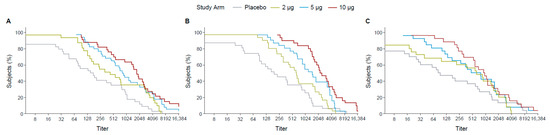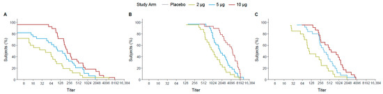 Following the first dose, the 10 µg TAK-426 group had 70% of participants with titers ≥ 128 while the 5 µg TAK-426 and the 2 µg TAK-426 groups had 70% of the participants with titers ≥ 64 and ≥16, respectively. The difference was greater at 2 months PD2, where 70% of the participants had titers ≥ 2048, ≥1024, and ≥512 in the 10, 5, and 2 µg groups, respectively. After 6 months following the second dose, the 10 µg and the 5 µg TAK-426 groups had similar antibody levels with 70% of the participants having titers ≥ 256, while titers in the 2 µg group dropped to ≥64 (Figure 3).