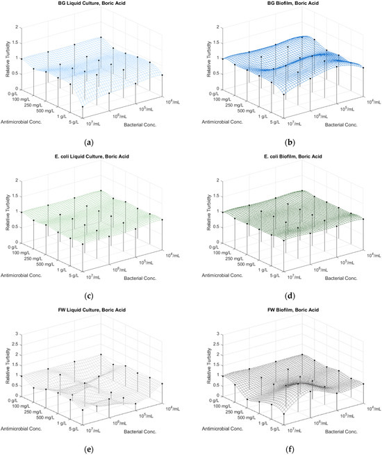 The effect of the concentration of antimicrobial agent boric acid and bacterial dilutions on the absorbance of the planktonic (liquid culture at 485 nm) and sessile (biofilm at 590 nm) of (a,b) Bacillus atrophaeus (BG), (c,d) E. coli and (e,f) FW bacteria.