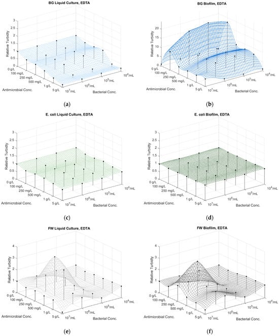 The effect of the concentration of antimicrobial agent edetic acid (EDTA) and bacterial dilutions on the absorbance of the planktonic (liquid culture at 485 nm) and sessile (biofilm at 590 nm) of (a,b) Bacillus atrophaeus (BG), (c,d) E. coli and (e,f) FW bacteria.