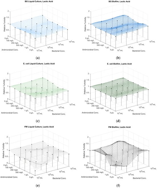 The effect of the concentration of antimicrobial agent lactic acid and bacterial dilutions on the absorbance of the planktonic (liquid culture at 485 nm) and sessile (biofilm at 590 nm) of (a,b) Bacillus atrophaeus (BG), (c,d) E. coli and (e,f) FW bacteria.