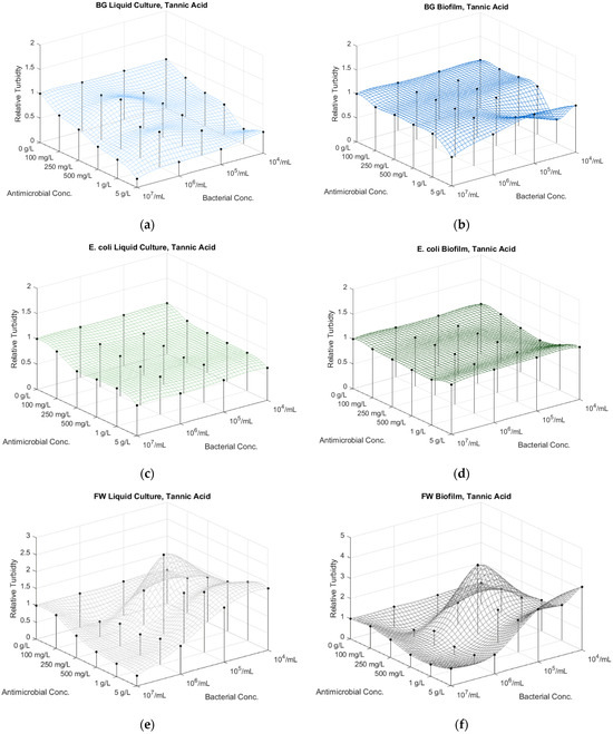 The effect of the concentration of antimicrobial agent tannic acid and bacterial dilutions on the absorbance of the planktonic (liquid culture at 485 nm) and sessile (biofilm at 590 nm) of (a,b) Bacillus atrophaeus (BG), (c,d) E. coli and (e,f) FW bacteria.