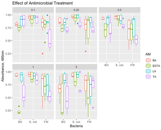 A boxplot of the data of absorbance versus bacteria (BG, E. coli, or FW) shows a trend of decreasing absorbance with increasing concentration (0.1 g/L–5 g/L) of the antimicrobial (AM) treatment (Figure 6). It is apparent that the antimicrobials were least effective on E. coli. Moreover, the FW bacteria and BG were the most susceptible to the antimicrobial agents, especially at higher concentrations.