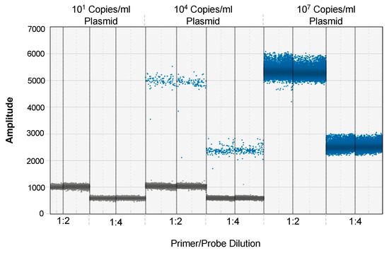 Excess primers and probes in a reaction mix have the potential to alter the signal-to-noise ratio. To overcome this concern, we first optimized the concentration of the EV-D68 VP-1-specific primers and probe for the ddPCR assay starting with the concentrations optimized for the qRT-PCR assay. Two dilutions of the primer/probe mix were tested using an equal amount of EV-D68 cDNA as the template in both dilutions. Though the separation between the positive and negative droplets at 1:2 dilution was higher than the 1:4 dilution, they were distinctly separated at the 1:4 primer/probe dilution to discriminate the positive droplets from the negative droplets (Figure 1). As the kinetics of viral loads decrease over time, the number of viral RNA copies declines after peak viremia. To detect these low copy numbers, a higher volume of the template needs to be included in the reaction mix. Using a 1:4 dilution of primer/probe mix compared to a 1:2 dilution permits the inclusion of additional templates without compromising the signal-to-noise ratio. Nonspecific amplification was not observed at either dilution, suggesting that a 1:4 dilution of primer/probe mix will optimally discriminate the positive from the negative droplets.