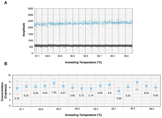 An optimal annealing temperature is critical to clearly separate the negative from the positive droplets and avoid nonspecific annealing. To determine the optimal annealing temperature for EV-D68-specific primers/probe, we determined the optimal annealing temperature at a 1:4 dilution of primer/probe mix using an annealing temperature gradient at temperatures of 58.0, 58.3, 58.7, 59.3 60.0, 60.5, 60.9, and 61.1 °C using the C1000 thermal cycler. Our results showed that the fluorescent amplitude, droplet dispersion, and separation between positive and negative droplets (Figure 2A) and across different concentrations (Figure 2B) were readily detectable at an annealing temperature of 60 °C, which aligned with the annealing temperature optimized for the qRT-PCR assay.