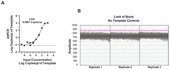 To assess the dynamic range, we determined the limit of detection (LOD) and blank (LOB) as these impact the sensitivity of the ddPCR assay. The LOD defines the lower and upper limits of the number of copies that can be detected in each reaction, whereas the LOB quantifies the number of false positives detected during the assay. The dynamic range for the assay was determined using an EV-D68 plasmid standard that was serially diluted to the lowest possible dilution to determine the maximum and minimum number of copies that could be detected using the ddPCR assay. Our results demonstrated that the highest number of copies that could be effectively detected without any loss of separation between the positive and negative droplets was 1.2 × 104 copies/μL of cDNA. On the other hand, the lowest number of copies that could be detected was 6.7 × 10−3 copies/μL (Figure 3A). No false positive droplets were observed with triplicate NTCs, suggesting that the LOB was 0 copies/μL (Figure 3B). Taken together, our results indicate that the dynamic range for the assay is from 6.7 × 10−3 copies/μL to 1.2 × 104 copies/μL of the sample.