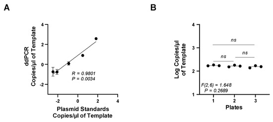 The limit of detection (LOD) was determined using a serially diluted EV-D68 plasmid, whereas three NTCs were quantified to determine the limit of blank (LOB). The LOD was defined as the lowest number of copies that could be consistently detected in 1 μL of cDNA and the LOB was determined as the number of positive droplets detected in triplicate NTCs. To establish precision, triplicate experiments were set up with positive control EV-D68 plasmids as independent replicates and tested for significance using One-Way ANOVA. A p < 0.05 was considered significant. To determine inter-plate variability, the EV-D68 plasmid standard was serially diluted and quantified using both ddPCR and qRTPCR assays, and the copy numbers/μL of cDNA were compared between the two assays. Simple linear regression was performed to determine the line of fit, and Spearman’s correlation was used to determine the correlation coefficient; a p < 0.05 was considered significant.