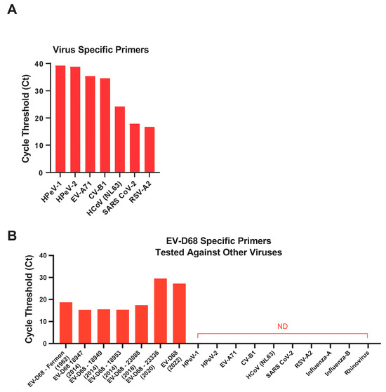 Specificity of EV-D68 primers. (A) The specificity of primers specific for HPeV-1 and -2, EV-A71, CV-B1, HCoV-NL63, SARS-CoV-2, and RSV-A2 were tested using RNA isolated from each virus in a SYBR Green relative RT-PCR assay. (B) The specificity of EV-D68 primers was tested against EV-D68 (Fermon, US/MO/14-18947, US/MO/14-18949, US/KY/14-18953, USA/2018-23088, USA/2020-23336 and an EV-D68-infected human nasal turbinate sample from the 2022 outbreak), HPeV-1 and -2, EV-A71, CV-B1, HCoV-NL63, SARS-CoV-2, RSV-A2, Influenza-A and -B, and Rhinovirus using EV-D68-specific primers in a SYBR Green relative RT-PCR assay.