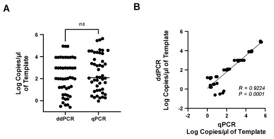 Real-time qRT-PCR assay is the most commonly used assay for detecting and identifying EV-D68 in clinical and research samples. To determine if copy numbers varied between the ddPCR and qPCR assays, the EV-D68 plasmid standard (107 copies/mL) was serially diluted 10× and used as a template simultaneously in both assays. A paired t-test was used to determine if the number of copies significantly differed between the two assays. Our results showed that the number of EV-D68 copies detected by the ddPCR assay did not significantly differ from that of the qPCR assay (Figure 6A), with a significant positive correlation (R = 0.9224, p < 0.0001) between the two assays (Figure 6B). The ddPCR assay detected a significantly lower number of copies as compared to the qPCR assay (Figure 6A).