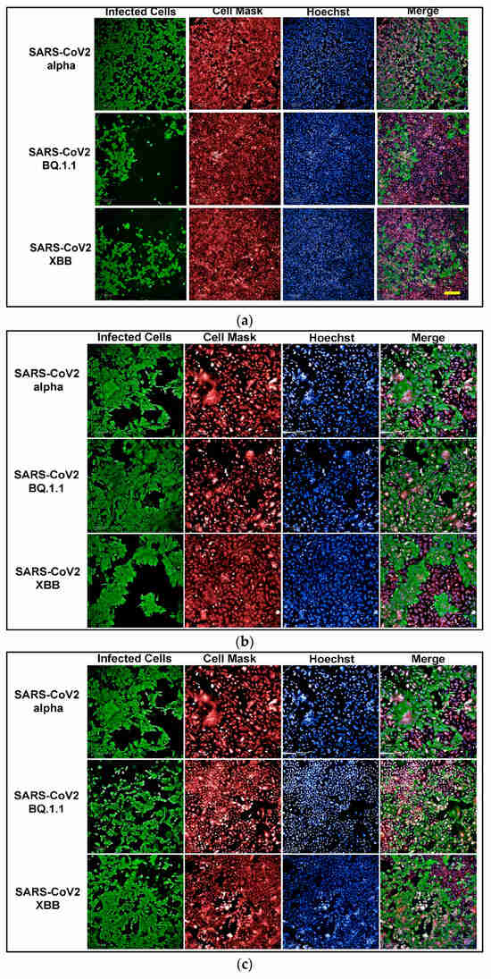 (a) High-content images of Vero E6 cells infected with the SARS-CoV-2 variants Alpha, BQ1.1, and XBB. In these high-content images, virus-infected cells are highlighted in green, while whole cells are stained in red using CellMask™, and nuclei are stained in blue using Hoechst dye. (b) High-content images of HeLa-ACE2 cells infected with the SARS-CoV-2 variants Alpha, BQ1.1, and XBB. In these high-content images, virus-infected cells are highlighted in green, while whole cells are stained in red using CellMask, and nuclei are stained in blue using Hoechst dye. (c) High-content images of A549-ACE2 cells infected with the SARS-CoV-2 variants Alpha, BQ1.1, and XBB. In these high-content images, virus-infected cells are highlighted in green, while whole cells are stained in red using CellMask™, and nuclei are stained in blue using Hoechst dye. (d) High-content images of Vero-TMPRSS2 cells infected with the SARS-CoV-2 variants Alpha, BQ1.1, and XBB. In these high-content images, virus-infected cells are highlighted in green, while whole cells are stained in red using CellMask™, and nuclei are stained in blue using Hoechst dye. Scale bar: 200 µm.