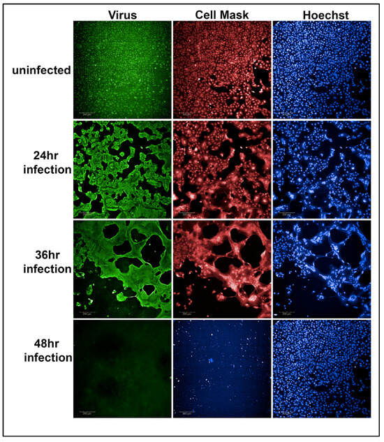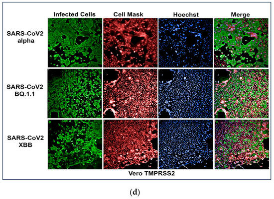 In these assays, Vero-TMPRSS2 cells were seeded into imaging plates (3000 cells per well, 40 µL per well) using a Fisher Multidrop Combi tip (Model 24073290). The plates were incubated for 24 h at 37 °C in a humidified 5% CO2 incubator and then infected with SARS-CoV-2 variants (Alpha, BQ.1.1, or XBB). We compared several durations of infection: 24 h, 36 h, and 48 h, along with varying multiplicities of infection (MOI) ranging from 0 to 0.5. After each incubation period (24, 36, and 48 h), the cells were fixed with 4% PFA for 15–20 min, washed with PBS, then blocked with blocking buffer for one hour at 37 °C in a humidified 5% CO2 incubator. To detect viral infection, SARS-CoV-2 Nucleocapsid Antibody (Rabbit Mab, Cat: 40143-R001, Sino Biologicals, Houston, TX, USA) was used as the primary Ab. It was diluted 1:1000 in blocking buffer, added to the plates (50 µL/well), and incubated for one hour at 37 °C in a humidified 5% CO2 incubator. Cells were washed with 0.05% Tween in PBS. Goat anti-rabbit IgG conjugated with Alexa 488 was used as the secondary Ab (Invitrogen Cat # A32731). It was diluted 1:2000 in blocking buffer and added to the plates (50 µL/well). The plates were incubated for 1 h at 37 °C in a humidified 5% CO2 incubator. Cells were stained using a 1:10,000 dilution of HCS CellMask™ Deep Red Stain (Invitrogen, Cat # H32721) in PBS and a 1:2000 dilution of the nuclear dye Hoechst 33342 (Invitrogen Cat # H3570) in PBS to visualize cell structures and nuclei, respectively. The infected cells were imaged using the Opera Phenix® Plus High-Content Screening System (Perkin Elmer, Waltham, MA, USA).
