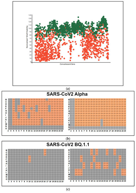 Due to the significant number of hits obtained in the primary screening, further testing was conducted on the convalescent sera at two lower concentrations, 1:200 and 1:2000, to evaluate the efficacy of the sera against all three variants of SARS-CoV-2: Alpha, BQ1.1, and XBB. The objective of these additional tests was to assess the effectiveness of the sera at lower concentrations prior to initiating dose–response studies.