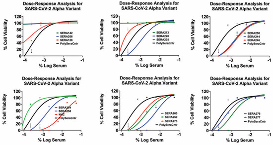 The normalized percentage of cell viability served as a quantitative measure for evaluating the potency of the tested antibodies in neutralizing SARS-CoV-2 variants. Figure 2 demonstrates the results obtained after a 48 h SARS-CoV-2 Alpha variant infection with an MOI of 0.37 in Vero-TMPRSS2 cells. Notably, the 48 h time point and MOI combination resulted in a complete loss of cells. Therefore, 48 h infections with a 0.37 MOI were selected for use in the primary screen of convalescent sera.