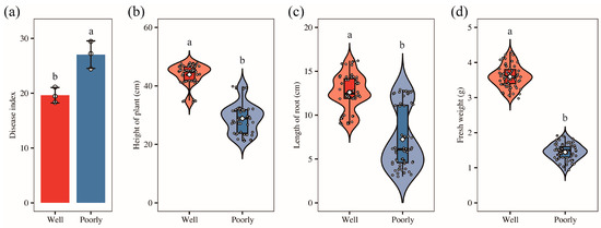 The disease index (a), plant height (b), root length (c), and fresh weight (d) of the well-growing (Well) and poorly growing (Poorly) wheat. Different letters indicate significant differences as determined by Duncan’s pairwise comparison (p < 0.05).