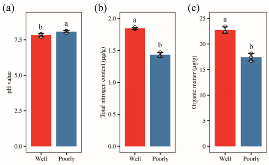 The pH value (a), total nitrogen content (b), and organic carbon content (c) of rhizosphere soil in well-growing (Well) and poorly growing (Poorly) wheat. Different letters indicate significant differences as determined by Duncan’s pairwise comparison (p < 0.05).
