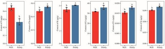 The contents of the mineral elements P, Na, K, Ca, Cu, and Sr in the rhizosphere soil of well-growing (Well) and poorly growing (Poorly) wheat. Different letters indicate significant differences as determined by Duncan’s pairwise comparison (p < 0.05).