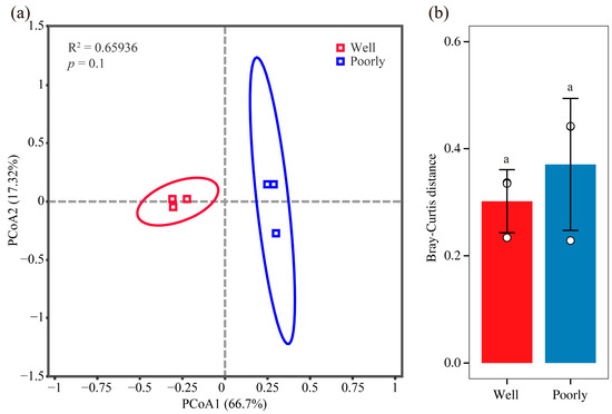 Beta diversity analysis of fungal communities. PCoA analysis (a) and Bray–Curtis distance (b) of rhizosphere soil in well-growing (Well) and poorly growing (Poorly) wheat. Different letters indicate significant differences as determined by Duncan’s pairwise comparison (p < 0.05).