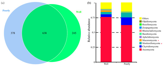 Venn diagram for the number of fungal OTUs (a) and relative abundance of fungal communities at the phylum level (b) in the rhizosphere soil of well-growing (Well) and poorly growing (Poorly) wheat. * indicates significant differences as determined by Duncan’s pairwise comparison (p < 0.05).