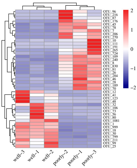 Heatmap showing differentially abundant fungal OTUs identified in the rhizosphere soil from well-growing (Well) and poorly growing (Poorly) wheat. OTUs with an absolute log2FC > 1 and padj < 0.05 were considered differentially abundant.