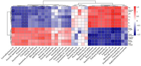 Mantel test analysis revealed significant correlations between the microbial community composition and seven environmental factors, including root length, plant weight, total nitrogen, organic carbon, Na, Ca, and Sr (Supplementary Figure S4). Further, Spearman correlation analysis provided deeper insights into these relationships. It showed that the abundance of pathogenic fungi Fusarium spp. and Dactylonectria torresensis decreased with increasing levels of pH, Cu, Ca, K, and Sr (Figure 8). This indicates that environments with higher pH and elevated mineral content are less conducive to the growth of these pathogens. Additionally, the abundance of symbiotic fungi Metarhizium anisopliae and Beauveria bassiana was inversely correlated with nitrogen and organic carbon (Figure 8). This indicates that high-nutrient conditions, characterized by elevated total nitrogen and organic carbon, may be unfavorable for these symbiotic fungi. Overall, total nitrogen and organic carbon showed significant correlations with the abundance of many fungi (Figure 8), emphasizing the critical role of soil nutrient conditions in regulating fungal community composition and growth.