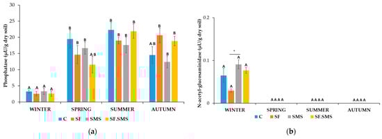 Between 5 and 25% of carbohydrates are found in soil organic matter, mainly in the form of simple sugars, hemicellulose, cellulose and other remnants of plant matter, which are then decomposed by microorganisms and used for the synthesis of more complex molecules [105]. Glycosidases are a group of enzymes that catalyze the hydrolysis of glycosides, which are the main energy source for soil microorganisms. Among the glycosidases, α-glucosidase and β-glucosidase (β-GLU) as well as α-galactosidase and β-galactosidase are most abundant in soil [27,52]. The activity of glycosidases has been positively correlated with soil pH in the past and their activity has been found to increase with increasing soil organic carbon [98]. NAG is an important glycosidase enzyme involved in the degradation of chitin and other β-1,4-linked glucosamine polymers to simple N-acetylglucosamine units. NAGs are mainly produced by fungi that contain chitin in their cell walls. Hydrolysis processes that occur under the influence of NAG enable the cycling of carbon and nitrogen [106]. By comparing the three farms (Figure 4b, Figure 5b and Figure 6b), the NAG activity in farm M (Figure 4b) was found to be the lowest, which could be explained by the use of mineral fertilizer as additional fertilization. In fact, the literature shows that high N and P fertilizer applications can suppress NAG activities, leading to a decrease in enzyme production when inorganic nutrients are readily available [107,108]. Moreover, NAG activity in farm M was detected only in winter, where the addition of SMS significantly increased the activity of NAG compared to the SF, but not compared to the C group and SF.SMS. In fact, higher NAG activity has been positively associated with soil pH and the amount of organic carbon and nitrogen in the soil [98,102], both present in high amounts in SMS and higher-plant-derived substrates as well [106]. Moreover, NAGs are mainly produced by fungi, and higher NAG activity may also indicate a higher microbial turnover in their favor [109]. A similar trend after the addition of different fertilizers and therefore a similar explanation could be observed in farm T in autumn (Figure 5b). However, compared to the very high NAG activity in the C group in this farm, the addition of fertilizers reduced its activity significantly. Compared to other groups, a relatively high NAG activity in the C group could reflect a high amount of fungi (Figure 2c). It is not surprising that the highest (except in winter), mostly consistent activity of NAG between the groups was found in farm S (Figure 6b). A relatively low pH accelerates the leaching of nutrients from the soil, which exacerbates nutrient limitation for soil microbes, hence causing a potential increase in NAG activity, whose hydrolysis processes enable the cycling of carbon and nitrogen [106].