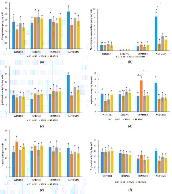 Effect of different fertilization types and seasonal changes in enzymatic activity in farm M. Enzymatic activity of phosphatase (a); enzymatic activity of N-acetyl-glucosaminidase (b); enzymatic activity of β-glucosidase (c); enzymatic activity of arylsulfatase (d); enzymatic activity of urease (e); enzymatic activity of arylamidase (f); enzymatic activity of alkaline phosphatase (g); enzymatic activity of acid phosphatase (h). Different uppercase letters indicate significant differences between the seasons in the same fertilizer treatment (p < 0.05). Asterisk (*) indicates a significant difference between different fertilizers in the same season (p < 0.05). Data from three independent experiments are presented as medians (geometrical shapes) with ranges. Soil without fertilizer (C: control); soil with single dose of composted spent mushroom substrate (SMS); soil with single dose of standard fertilization (SF); soil with half dose of SF and half dose of SMS (SF.SMS).