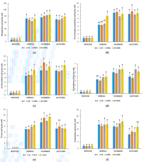 The lowest effect of different fertilizations on PHOS activity was observed in winter (Figure 6a). In addition, a different effect was observed in spring and autumn after different fertilizations. In summer, all types of fertilization increased PHOS activity. However, none of the fertilization effects mentioned were statistically significant. Seasonal changes were observed in the warmer seasons (spring, summer and autumn) for all fertilization groups compared to the C group. In fact, a significant increase in PHOS activity was observed in spring, summer and autumn in the C group (p = 0.012, p = 0.009 and p = 0.010. respectively), SF group (p = 0.010, p < 0.001 and p = 0.033, respectively), SMS group (p = 0.012, p < 0.001 and p = 0.004, respectively) and SF.SMS group (all p < 0.001). The activity of the NAG enzyme is shown in Figure 6b. Like in PHOS, the lowest NAG activity was determined in winter (0.91–1.06 µU/g dry soil). In other seasons, only non-significant differences between the fertilization groups were observed. However, seasonal variations showed more effects on NAG activity. In all fertilization groups, a significant increase in the activity of the enzyme was observed in the warmest seasons (summer and autumn) compared to the winter: C group (p = 0.019 and p = 0.029, respectively), SF group (both p = 0.001), SMS group (p = 0.049 and p = 0.039, respectively) and SMS.SF group (p = 0.014 and p = 0.017, respectively). In the latest group, a statistically significant difference between the NAG activity in spring and winter (p = 0.033) was found as well. A similar trend in the effects of fertilization as in Figure 6a,b was observed for β-GLU activity (Figure 6c). Spring, summer and autumn were again the most active seasons in which β-GLU activity increased the most for all groups compared to the C group. Again, the effects of fertilization were not statistically significant. Nevertheless, statistically significant differences were found between the warmest seasons and winter for all fertilization groups. In fact, β-GLU activity was again significantly reduced in winter compared to spring, summer and autumn for the C group (p = 0.013, p < 0.001 and p = 0.007, respectively), the SF group (p = 0.021, p < 0.001 and p = 0.005, respectively), the SMS group (p = 0.001, p < 0.001 and p < 0.001, respectively) and the combined SF.SMS group (p = 0.001, p < 0.001 and p < 0.001, respectively). Figure 6d shows the activity of the ARS enzyme in each season. The highest activity of ARS appeared to be in summer (4.78–5.75 µU/g dry soil) and the lowest in winter (0.33–0.48 µU/g dry soil), regardless of the fertilization. However, the effect of different fertilization on ARS activity was not significant for all the seasons. Statistically significant increases in ARS activity in spring, summer and autumn, compared to winter were observed in the SF (p = 0.001, p < 0.001 and p < 0.001, respectively), the SMS (p = 0.003, p < 0.001 and p < 0.001, respectively) and the SF.SMS (p = 0.002, p < 0.001 and p < 0.001, respectively) groups. In the SF group, a significant difference in enzyme activity was also found between spring and summer (p = 0.035). In the C group, a significant increase in ARS activity was restricted to summer (p = 0.018) and autumn (p = 0.050) when comparing activity in winter. URE activity is shown in Figure 6e. Again, the highest enzyme activity was detected in the warmer seasons (summer, SF.SMS: 11.38 µU/g dry soil), while no activity of URE was detected in winter. It appeared that all fertilization types affected the activity of URE compared to the C group; however, none of the effects were significant. Due to the inactive winter season, the change to warmer seasons significantly increased the activity of URE in all groups. Statistically significant differences between winter and spring/summer/autumn in the C (p = 0.011/p = 0.003/p = 0.012), SF (p = 0.006/p < 0.001/p = 0.002), SMS (p = 0.007/p < 0.001/p = 0.011) and SF.SMS groups (p < 0.001/p < 0.001/p = 0.001) were found. In addition, URE activity was significantly higher in the SF group in summer than in spring (p = 0.030). The highest activity in ARN was observed in all groups in spring and summer, followed by autumn and winter (Figure 6f). Fertilizers slightly increased the enzyme activity compared to that of the C group in spring, summer and autumn. However, this was not the case with SF in spring and summer. Nevertheless, the differences between the fertilization groups were not significant. As expected, the reduction in ARN activity in winter compared to the other seasons (spring, summer and autumn) was significant in the C group (p < 0.001, p < 0.001 and p = 0.014, respectively), the SF group (p < 0.001, p = 0.008 and p = 0.016, respectively) and the SMS group (p = 0.001, p = 0.001 and p = 0.020, respectively). In the SF.SMS group, a decrease in ARN activity in winter was only observed when comparing activity in spring and summer (p = 0.040 and p = 0.023, respectively). Spring, summer and autumn were again the most active seasons in terms of PAK activity (Figure 6g). In contrast to other enzymes, the highest PAK activity was observed for all groups in autumn. Except in spring for the SMS and SF.SMS, fertilization increased PAK activity compared to the C group. In all seasons, however, the differences between the fertilization groups were not significant. The effect of seasonal variation could be detected in all groups as PAK activity was low in winter (1.20–1.24 µU/g dry soil). Indeed, PAK activity increased significantly in all groups in spring, summer and autumn compared to the activity in winter (group C: p = 0.007, p = 0.016 and p < 0.001, respectively; SF: p = 0.018, p = 0.003 and p = 0.006, respectively; SMS: p = 0.003, p = 0.002 and p < 0.001, respectively; SF.SMS: p = 0.015, p = 0.010 and p < 0.001, respectively). A statistically significant difference was also found between the activity in spring and autu