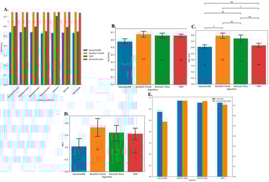 Modeling metrics. (A) Performance of scaling methods. (B) Accuracy of machine learning algorithms using Uniform, the best scaling method. (C) ROC–AUC of machine learning algorithms using Uniform, the best scaling method. *, p-value of ≤0.05; ns, p-value of >0.05 (Mann–Whitney multiple groups comparison with Bonferroni correction). (D) MCC of machine learning algorithms using Uniform, the best scaling method. (E) Comparison of accuracy metric between training and test datasets among machine learning algorithms.