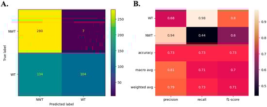 Metrics of supervised learning. (A) The confusion matrix shows correct and incorrect predictions for WT and NWT phenotypes, and (B) heatmap resuming the main classification metrics.