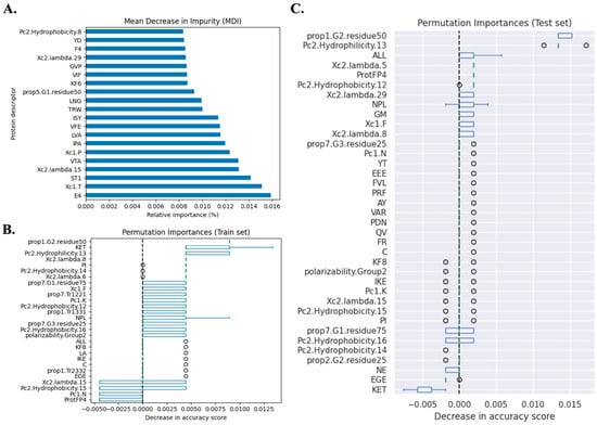 Figure 4C presents the impact of the permutation shuffling of values in the test dataset. The main descriptors that varied included the distribution descriptor (attributes: prop1.G2.residue.50 and prop7.G1.residue.75), tripeptide frequency descriptor (attributes: ALL, NPL, and KET), PseAAC descriptor (attributes: Xc2.lambda.29, Xc1.F, and Xc2.lambda.8), dipeptide frequency descriptor (attributes: GM and NE), and APseAAC descriptor (attributes: Pc2.hydrophobicity.13 and Pc2.hydrophobicity.16).