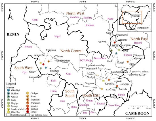 - Fagbamila, I.O.; Barco, L.; Mancin, M.; Kwaga, J.; Ngulukun, S.S.; Zavagnin, P.; Lettini, A.A.; Lorenzetto, M.; Abdu, P.A.; Kabir, J.; et al. Salmonella serovars and their distribution in Nigerian commercial chicken layer farms. PLoS ONE 2017, 12, e0173097. [Google Scholar] [CrossRef] [PubMed]