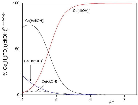 The distribution diagram reported in Figure 2 shows Ce-complexes considering in the model 1.0 mM Ce3+, 3.0 mM total phosphate, and 40.0 mM total citrate. The abscissa runs up to pH 7.36 when the formation of solid CePO4(s) is observed. Thus, in the data set used to plot the diagram, a logKs of −19 had to be assumed for CePO4(s) freshly formed, instead of the value of −26.27 reported for the aged solid, to model the experimental observations showing non-precipitation up to a pH of about 7.5 (Figure 3—MCML at 0 and 1.0 mM Ce3+).