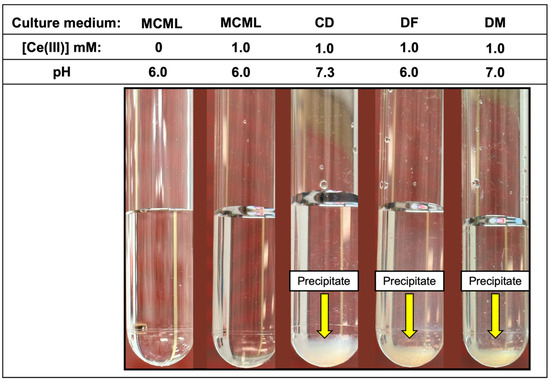 In the MCML, a solubility up to 100 times greater than DF and DM (1.0 mM vs. 0.01 mM) was observed for Ce3+ and La3+, where a precipitate was already recorded at 0.05 mM (Table 3). While in CD, even at the 0.01 mM Ce3+ or La3+ concentration, a precipitate, as a white fluffy cloud, was observed (Table 3). Among the three Ln3+ in the test tube assay, Gd seems to be the most soluble one; in fact, in MCML, no precipitate was observed up to 5.0 mM, whilst for both DF and DM, a solubility no higher than 0.05 mM was recorded. Once again, in CD, even at a Gd3+ concentration of 0.01 mM, a precipitate was observed (Table 3). Finally, the precipitate was observed at the highest Ce3+ concentration in the various tested culture media (Figure 3).