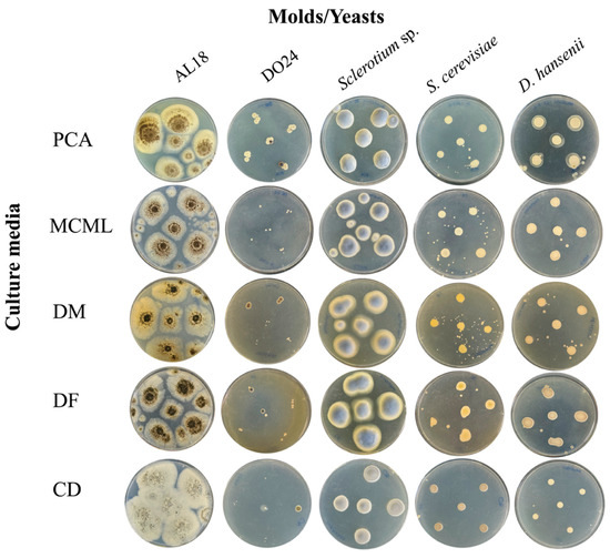 The potential of MCML on different microorganism growth was evaluated by testing a panel of 84 bacteria (Figure 4, Table S2, Figure S3) and five fungi (two yeasts and three molds) (Figure 5, Table S2). We used the PCA as a control medium, where all microorganisms were able to grow. It was observed that MCML supported the growth of 75% (63 of 84), whilst DF saw a growth of 81% (68 of 84) (Table S2). The DM culture medium allowed the cultivation of only 50% (68 of 84) of the total tested bacteria (Table S2). Finally, the CD medium supported more than 90% of microbial growth for both amounts of used sucrose (81 of 84 with 30.0 g L−1 sucrose and 78 of 84 with 2.0 g L−1) (Table S2). Finally, all tested fungi (AL18, DO24, Sclerotium sp., D. hansenii, and S. cerevisiae) grew on all the tested culture media (Figure 5, Table S2).